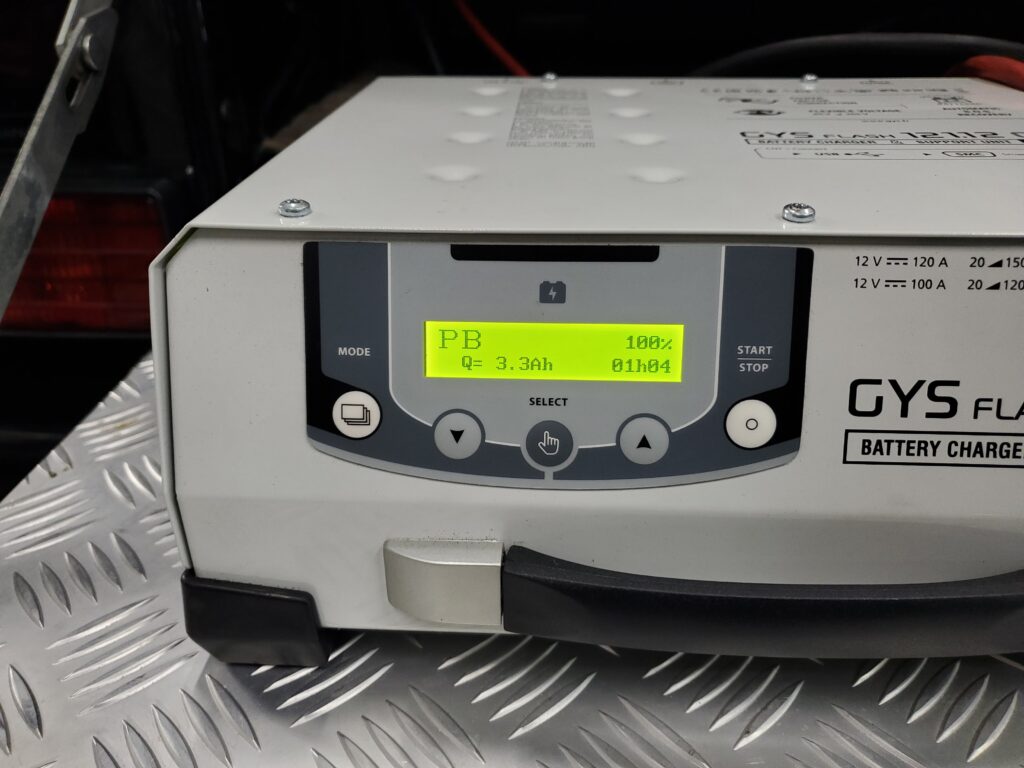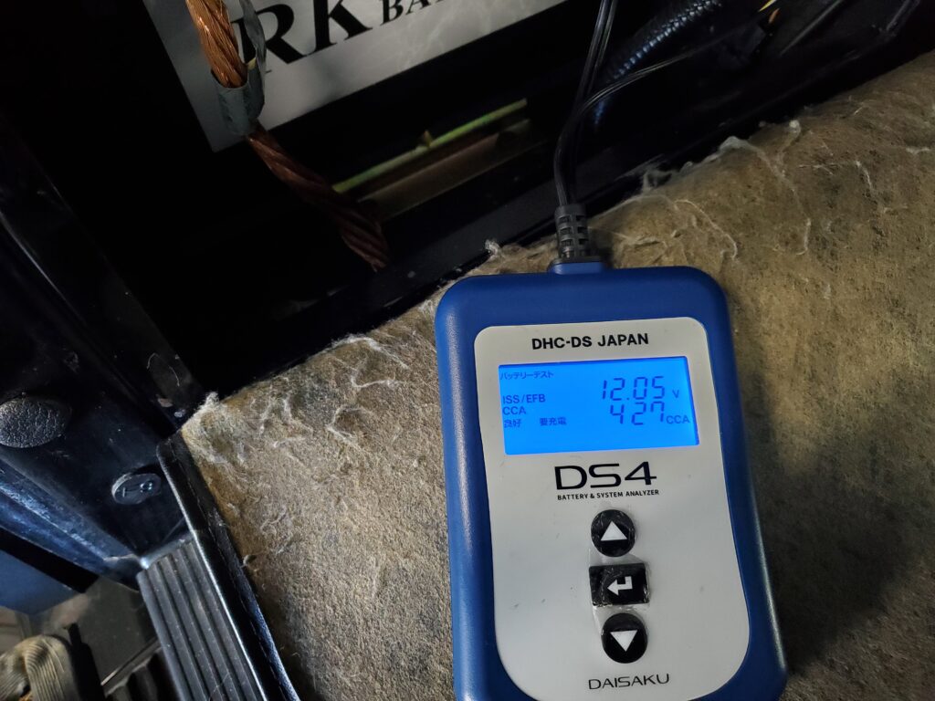もう一つのこだわりは、バッテリー整備です。 搭載されていたのはAGMバッテリー。テスター診断では「要充電」の結果が出ました。 鈴岩オートでは、ただ充電器をつなぐだけでなく、AGMバッテリー専用のプロ用充電器「GYS FLASH」を使用して、バッテリーの性能を最大限まで回復させます。これにより、高価なAGMバッテリーの寿命を延ばし、オーナー様の出費を抑えることにも貢献します。