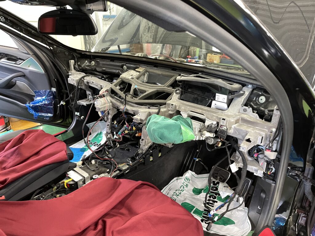 まずはダッシュパネルの部品を一つずつ丁寧に分解。最新の欧州車は内装のクリップ一つとっても非常に繊細です。慎重に、慎重に進めて行きます。