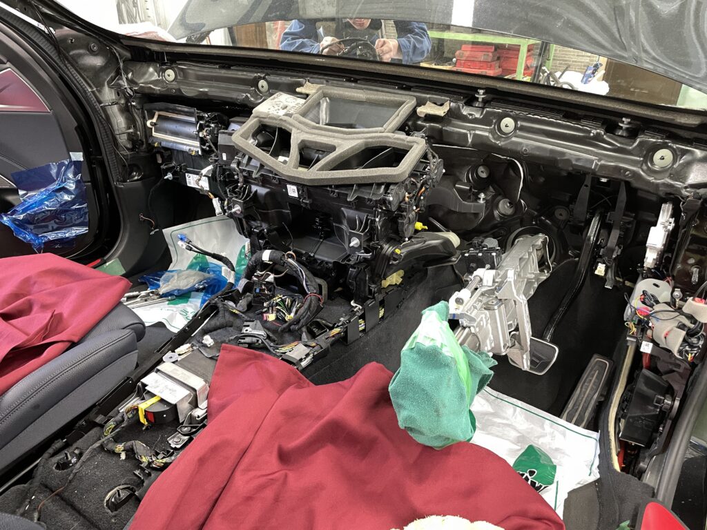 ダッシュボードを降ろし、骨格を外し、エアコンユニットを割る。ここまで分解して初めて、不具合の原因に手が届きます。手間を惜しまず、一つひとつの工程を積み重ねること。それがオーナー様の信頼に応える、唯一の方法だと考えています。