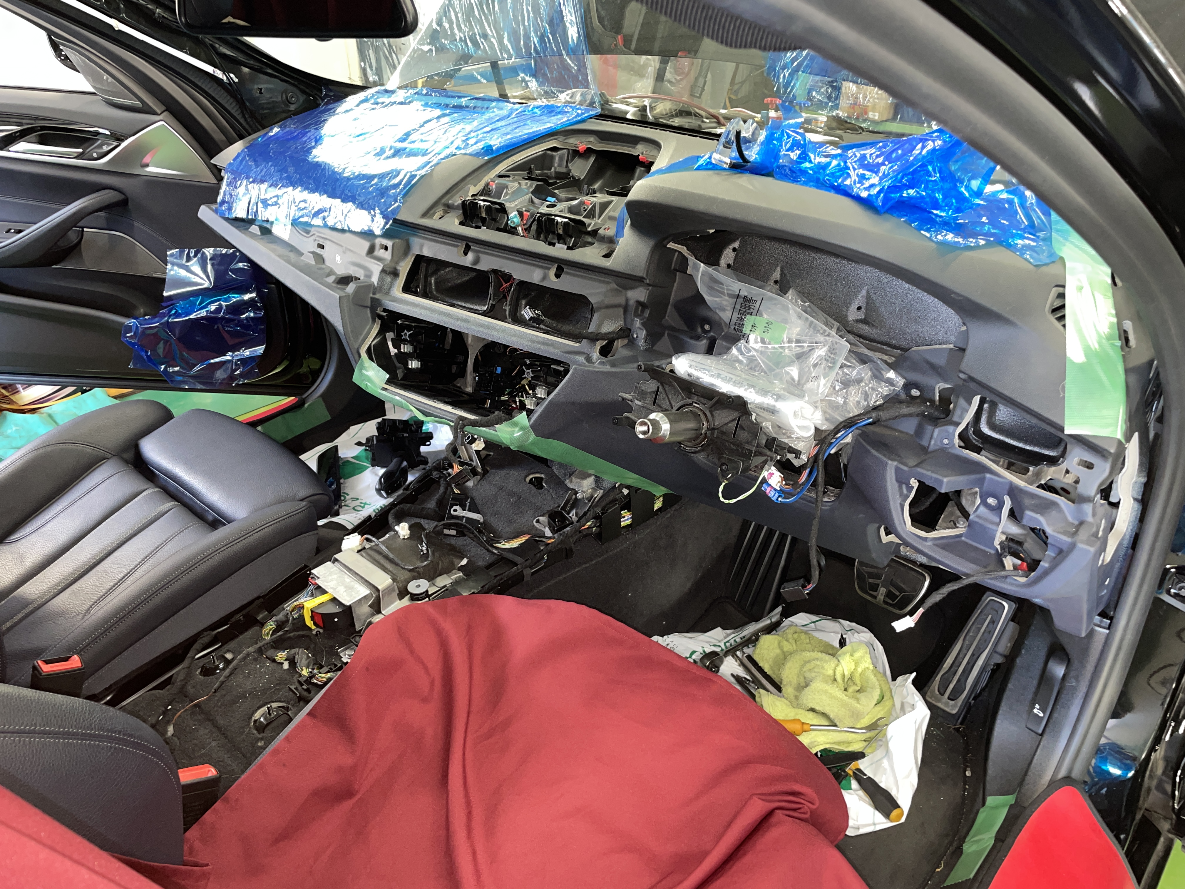 まずはダッシュパネルの部品を一つずつ丁寧に分解。最新の欧州車は内装のクリップ一つとっても非常に繊細です。慎重に、慎重に進めて行きます。