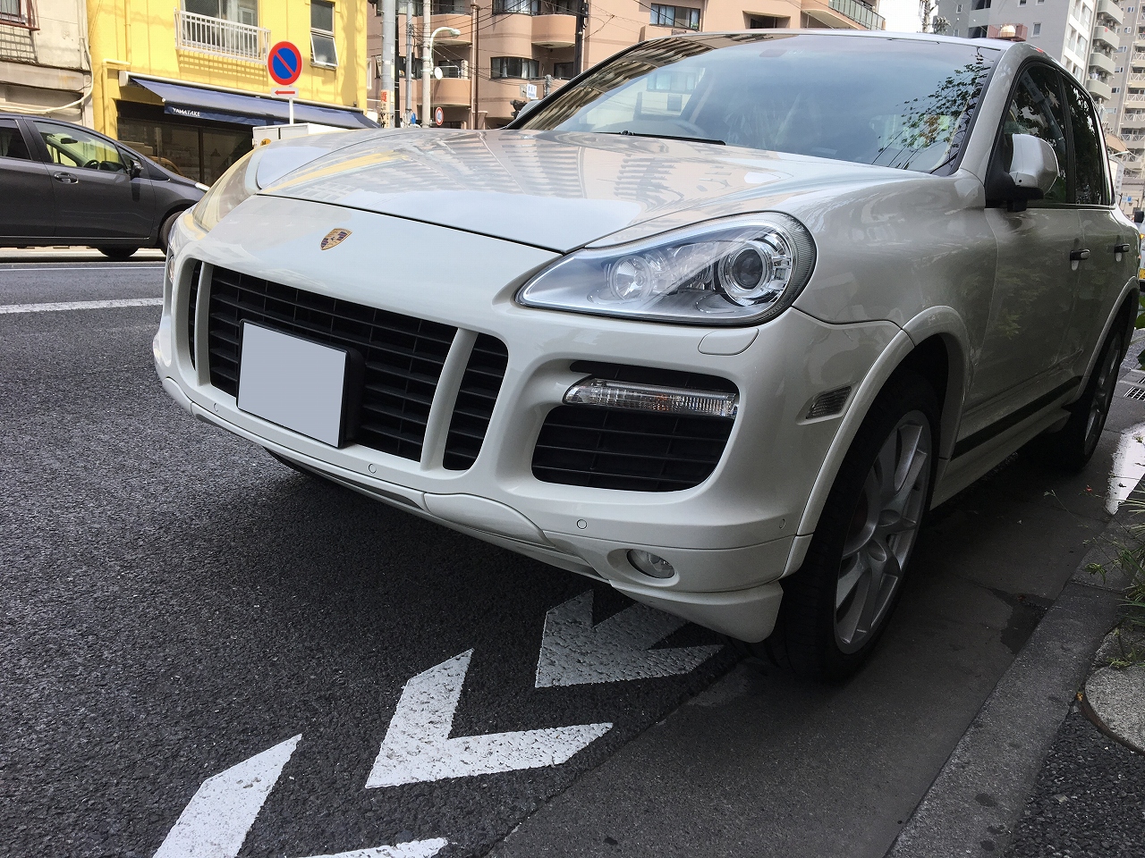ポルシェカイエン、板金修理のご依頼にてご入庫頂きました。フロントバンパーフェース左サイドのキズの補修依頼です。